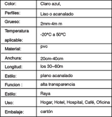Sirven como separadores de ambientes en bodegas y galpones industriales hasta +65ºc. Se usan como Porton y puertas de bodegas, aislando temperatura, aves, insectos y materiales volátiles en general. REFRIGERANT le instala su cortina de lamina de pvc, no lo dude llámenos, y compruebe nuestra calidad en el servicio y nuestra rápidez. ![]() CORTINA PLÁSTICA REFORZADA (Para baja temperatura)